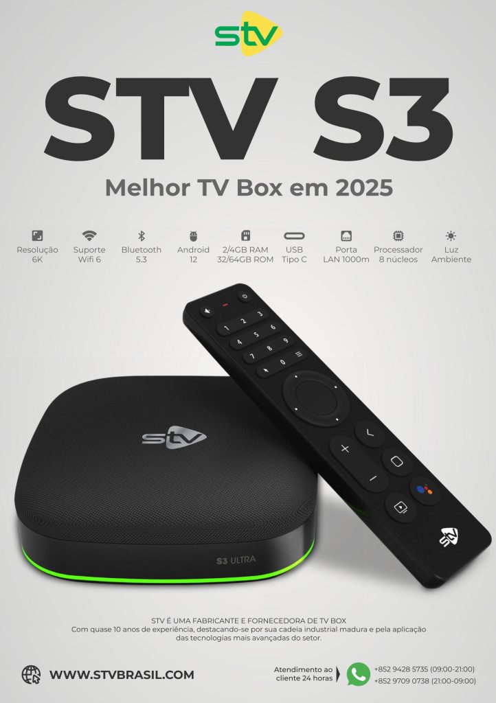 STV S3 Pro - 6K - 2/32GB - Wi-Fi - Bluetooth - Android 12 - Comando de voz - 2025 Receptor IPTV (Sem Antena) STV S3 Pro - 6K - 2/32GB - Wi-Fi - Bluetooth - Android 12 - Comando de voz 2025       ... R$ 639,90